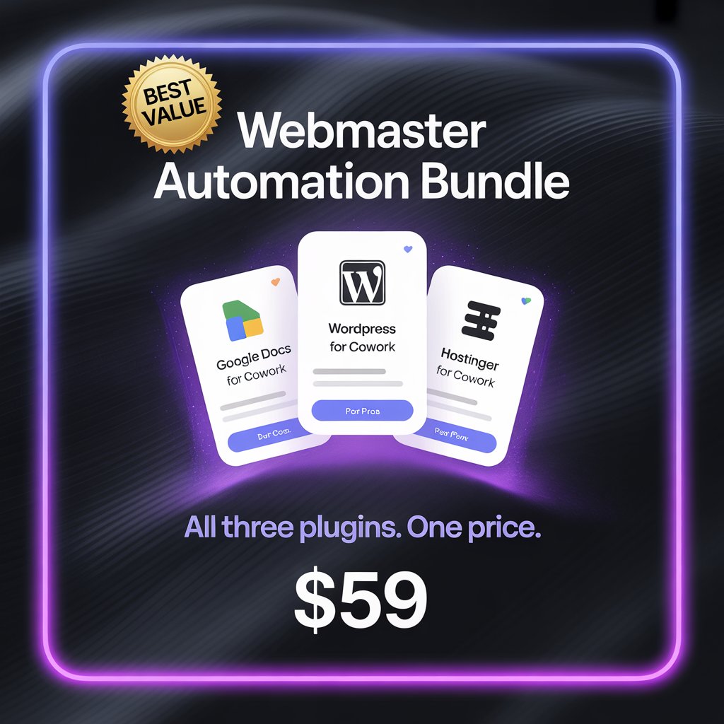 This storefront β coworkplugins.shop β was built autonomously using the WordPress plugin in this bundle. Every page, product, setting, and SSL certificate was managed through Claude Cowork. Not a single dashboard was opened.